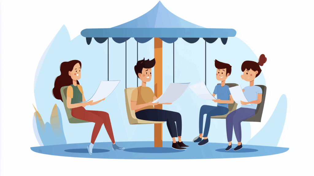 Das Ideenkarussell ist eine kreative Beteiligungsmethode, die sowohl zur Ideenfindung als auch zur Diskussion eingesetzt werden kann. Durch den schriftlichen Austausch der Teilnehmenden werden gewöhnliche Kommunikationsmuster aufgebrochen.